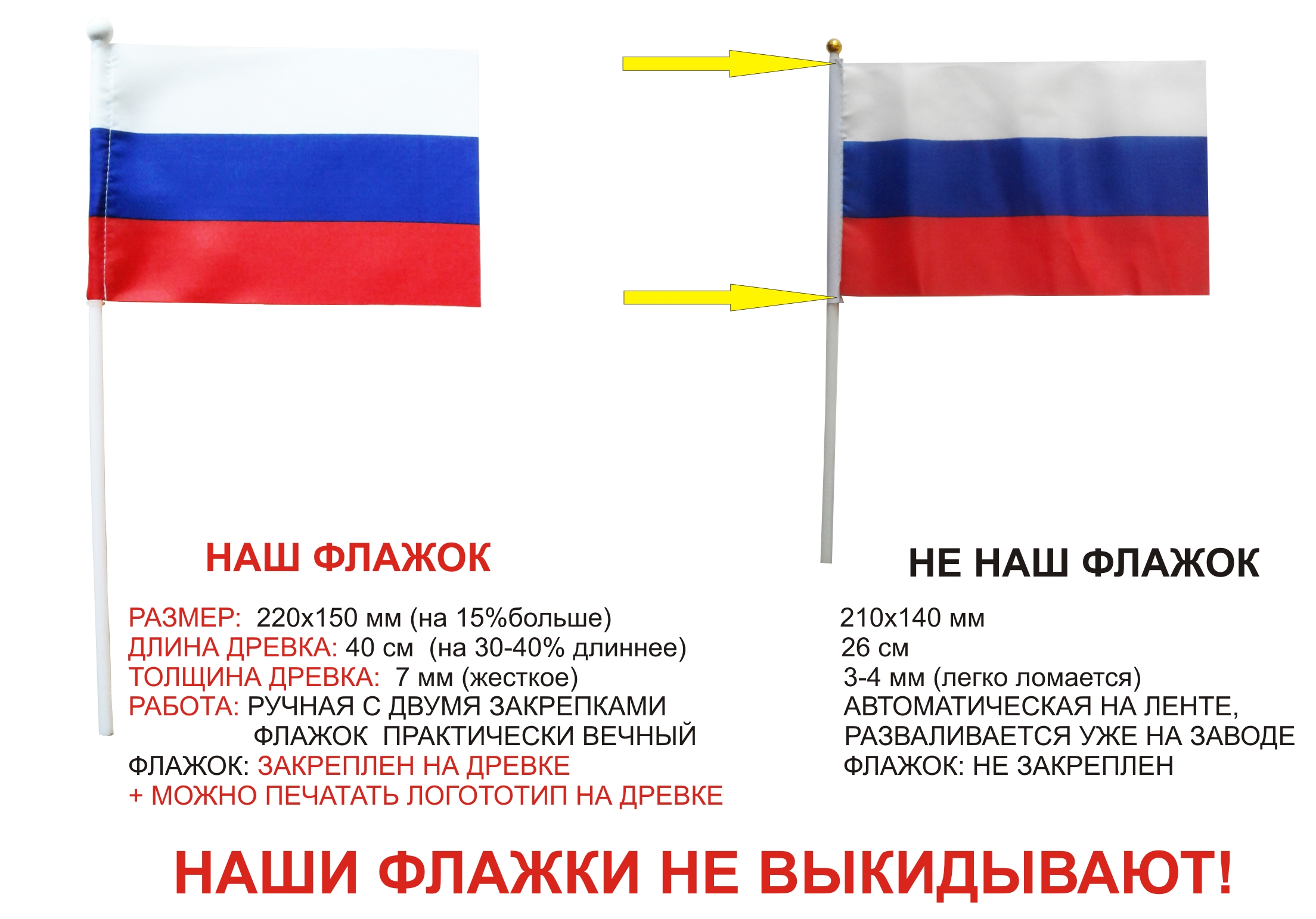 ЦЕНА со склада – от 14 рублей, с НДС. (Смотрите прайс-лист и информацию о крупных заказах.) Описание: Размер – 22,5х15 см, ткань - полиэстер (полиэфирный шелк), двухсторонний, сквозная трафаретная печать, плотность красок на обратной стороне – 92% от лицевой, плотность ткани - 55 г/м2 , ручная прошивка с двумя фиксирующими стежками, карман под древко – 12 мм. Поставляется с древком-флагштоком. Древко: материал – пластик (полипропилен), длина – 40 см, толщина – 7 мм, вес – 5,4 г, с креплением – силиконовым кольцом и шариком-навершием, диаметром 15 мм. КОЛИЧЕСТВО / ЦЕНА С НДС: 100 / 17,80 ₽/шт 200 / 17,60 ₽/шт 300 / 16,80 ₽/шт 500 / 16,00 ₽/шт 1 000 / 15,60 ₽/шт 2 000 / 15,30 ₽/шт 3 000 / 15,00 ₽/шт 6 000 / 14,90 ₽/шт 12 000 / 14,80 ₽/шт